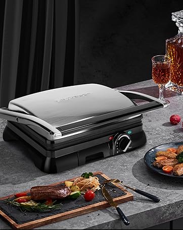 et aussi comme presse à panini, appareil à sandwich et grille-pain car ses charnières ajustent la hauteur pour s’adapter à tous types de tailles et d’épaisseurs.