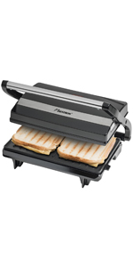 Un gril conçu sur mesure : sa taille idéale vous permet de préparer jusqu'à deux toasts simultanément - parfait pour vos sandwichs, tels que les hamburgers, mais aussi vos légumes et viandes. Grâce à la lampe témoin, vous gardez un oeil sur le processus de grillage.