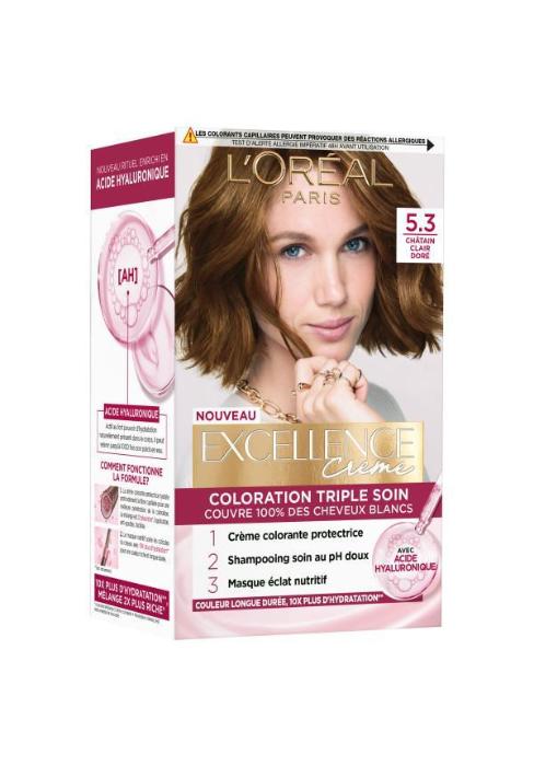 Excellence Crème de l’Oréal Paris vous sublime grâce à une qualité de cheveux visiblement meilleure que sans coloration. Enrichie en acide hyaluronique* pour 10x plus d’hydratation**, elle couvre 100% des cheveux blancs*** pour tous les types de cheveux. Sa crème colorante protège et nourrit les cheveux pour une couleur riche, intense et longue durée.