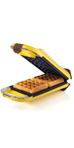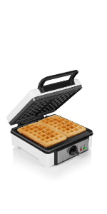 Ce gaufrier, doté d’une surface de cuisson de 19,8 x 19,8 cm et vous permet de préparer deux grandes gaufres belges aux dimensions généreuses (4 carrés de pâte en largeur pour 7 en longueur) à la fois. Garnissez-les ensuite comme vous le souhaitez.