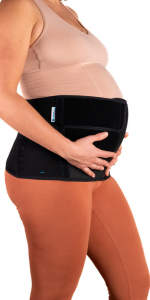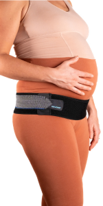 porté par une personne en tenue grise, tenant un nourrisson dans ses bras. Logo et texte « Physiomat Laissez-vous porter