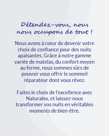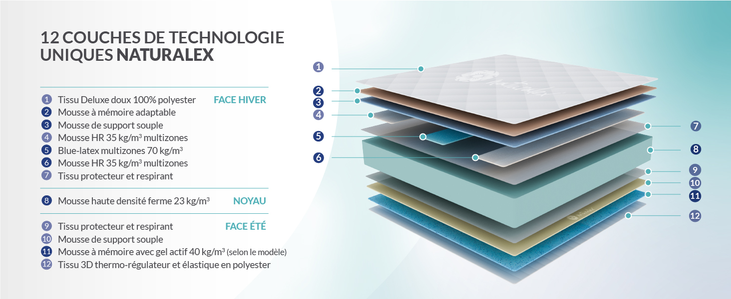 La combinaison de ces matériaux premium vous offre un support optimal, une répartition équilibrée du poids corporel, une régulation de la température et un confort personnalisé pour un sommeil de qualité supérieure.