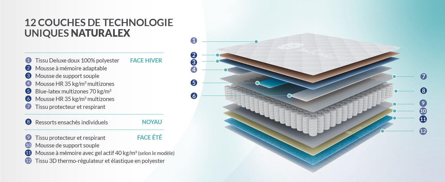 La combinaison de ces matériaux premium vous offre un support optimal, une répartition équilibrée du poids corporel, une régulation de la température et un confort personnalisé pour un sommeil de qualité supérieure.